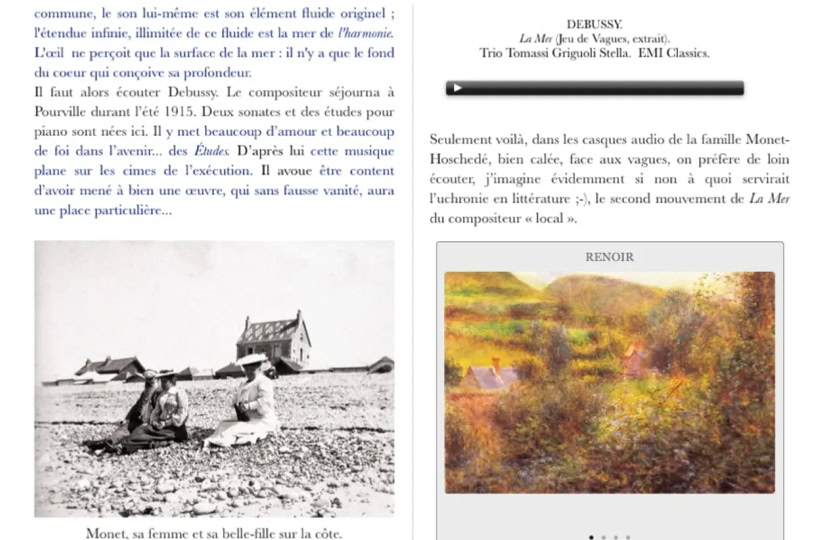 Le format ePub3, pour Mac OS et iPad & Thorium, nous permet de restaurer l'unité entre la littérature, la musique & l'image, offrant une lecture immersive fidèle à l'esprit de l’Impressionnisme.